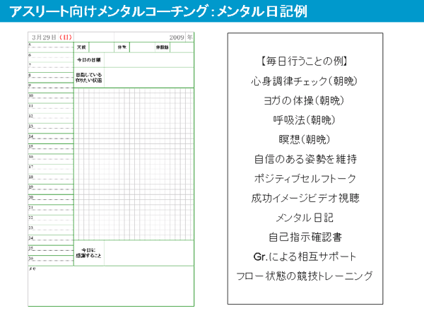 自己分析シートを作成してもらうことで、勝つときのパターンと負けるときのパターンが判り、今の取り組みが、勝つときの態度と一致しているかどうかが確認できるようになります。また、契約時に行う、個人ワークシートにより、競技での成功と自分の人生での成功との関連や、生きる意味や選手であることの意味などを明らかにした上でサポートを開始しています。